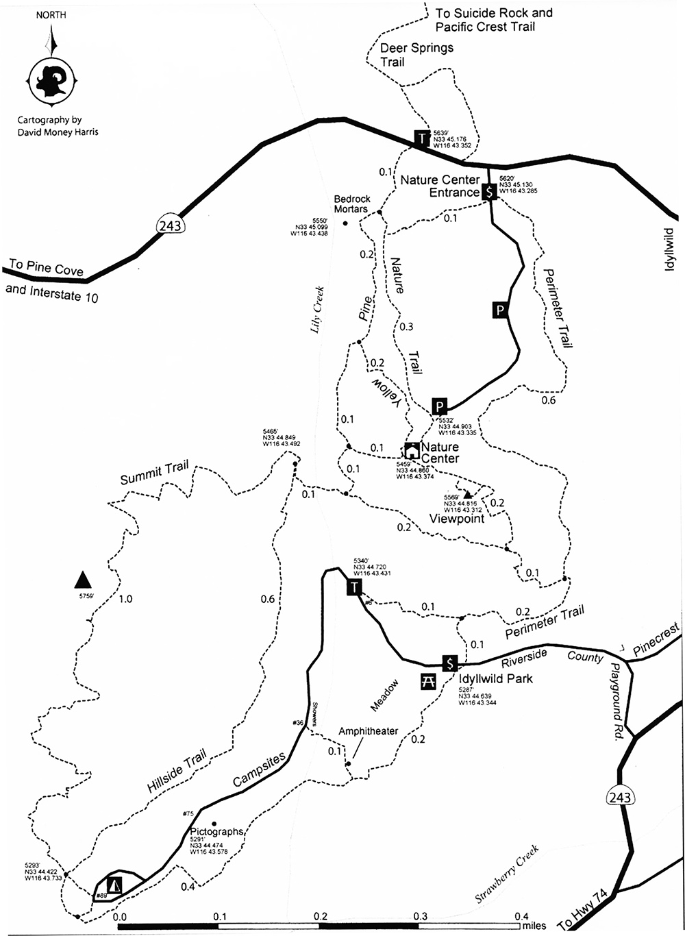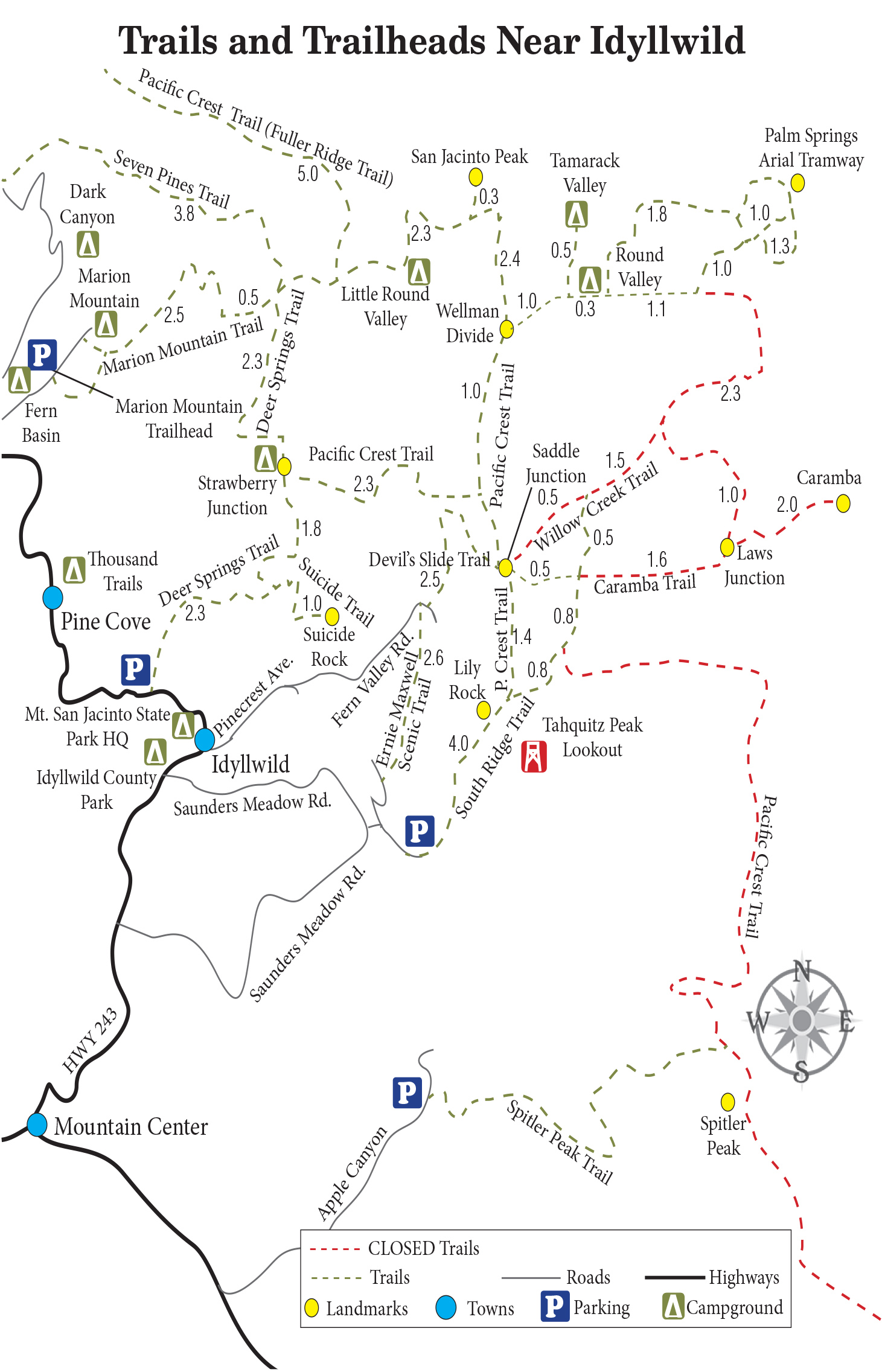 Deer Springs Trail • One-way distance = 3.3 miles; Elevation gain in feet = 1,700 • Moderate • Forest Service Permit Required • Highway 243, 1 mile north of Idyllwild to Suicide Rock